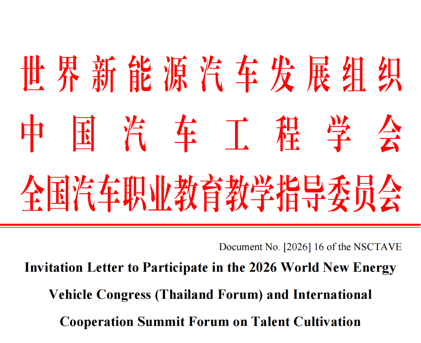 Warm greetings! The global new energy vehicle industry has entered a new stage of in-depth integration of electrification, intelligence and globalization. As an important global automotive market, Thailand boasts enormous potential in market scale, technological innovation and talent cultivation, with a robust development momentum in the new energy vehicle sector, emerging as a core growth driver for the new energy vehicle industry in Southeast Asia. To deepen international cooperation in the new energy vehicle industry’s talent cultivation and vocational education between China, Thailand and countries and regions along the Belt and Road, the World New Energy Vehicle Development Organization, China Society of Automotive Engineers (CSAE) and the National Steering Committee of Teaching for Automobile Vocational Education, China are scheduled to jointly hold the 2026 World New Energy Vehicle Congress (Thailand Forum) and International Cooperation Summit Forum on Talent Cultivation in Bangkok, Thailand on April 3rd-April 4th, 2026.